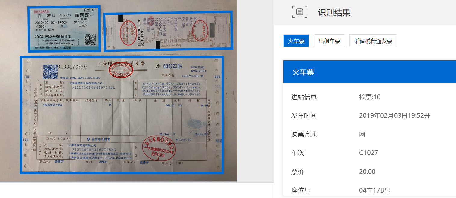 2、该通用票据识别支持增值税发票、火车票、出租车票、车辆发票、飞机行程单、定额发票等多种票据智能分类、识别以及结构化字段信息提取